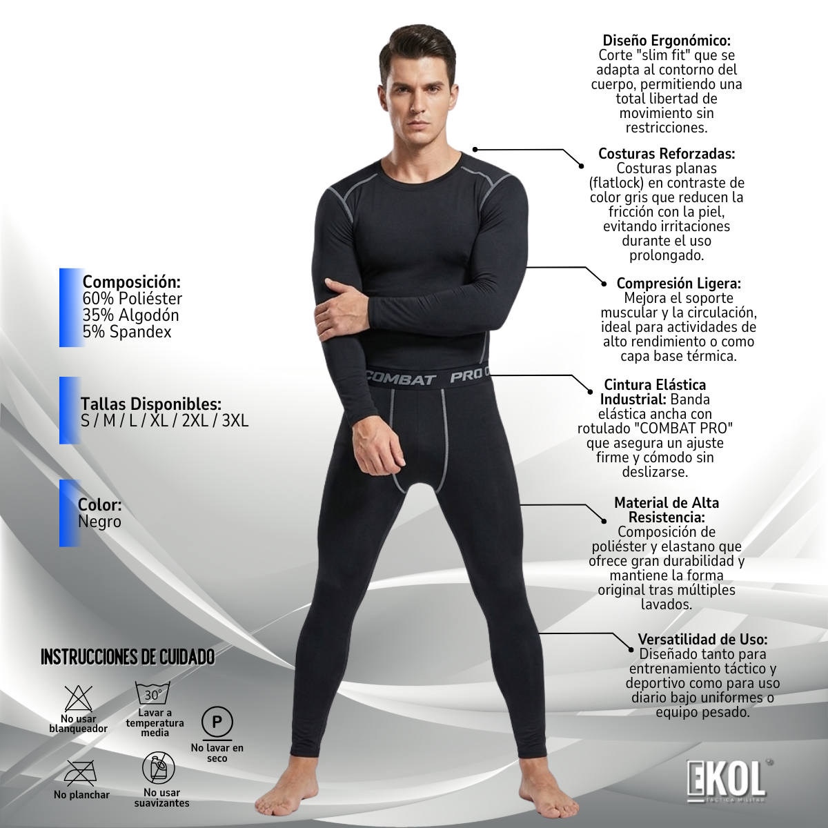 Eleva tu rendimiento en condiciones exigentes con el Conjunto Primera Capa Combat Pro. Diseñado bajo estándares tácticos, este set de camiseta y calza ofrece el equilibrio perfecto entre compresión muscular y aislamiento térmico, manteniéndote seco, cómodo y ágil durante toda tu jornada.
